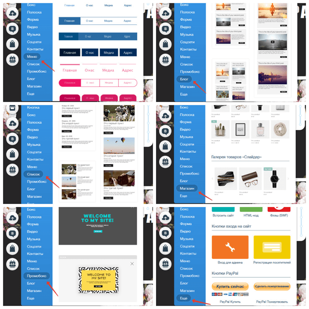 Для создания сайтов на этом сервисе используются разные виджеты, благодаря которым процесс построения страницы в визуальном редакторе выполняется в несколько кликов.